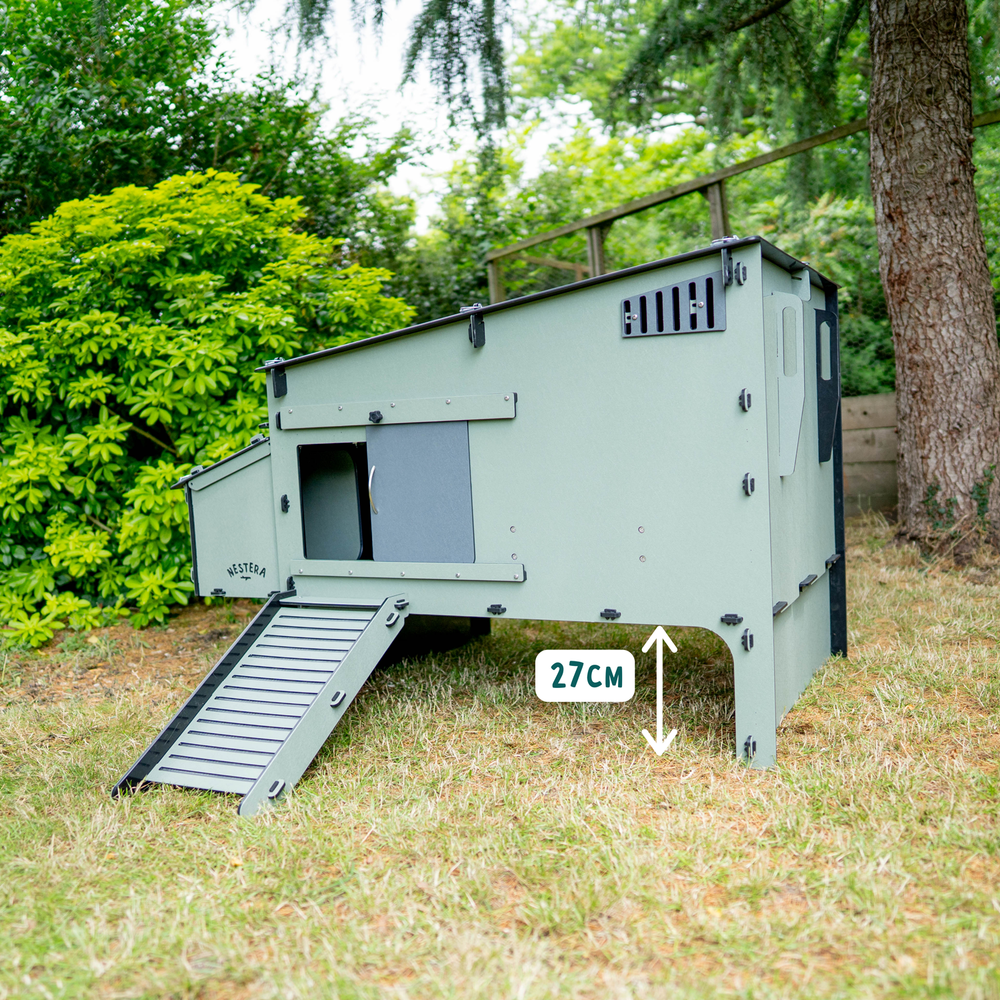 The Penthouse model features a sheltered space beneath the coop, offering extra protection from sun, wind, and rain.